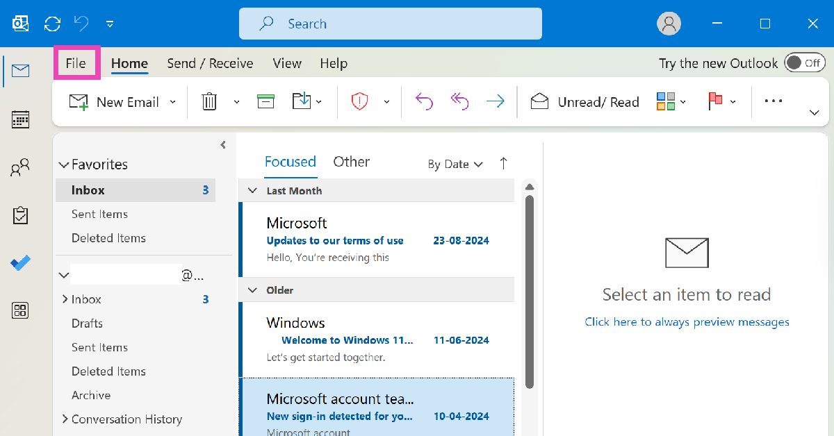 Stap 1: LaunchOutlook op uw pc en klik opBestand.