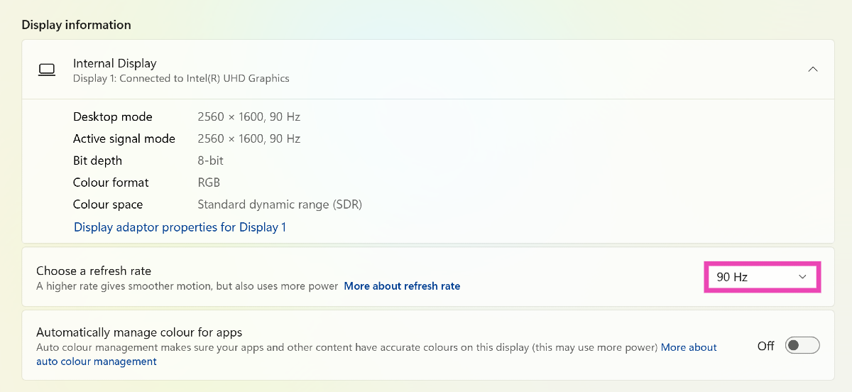 Ga naarInstellingen>Systeem>Weergave>Geavanceerde weergaveen klik op het vervolgkeuzemenu naast 'Vernieuwingsfrequentie' om de juiste optie te selecteren.