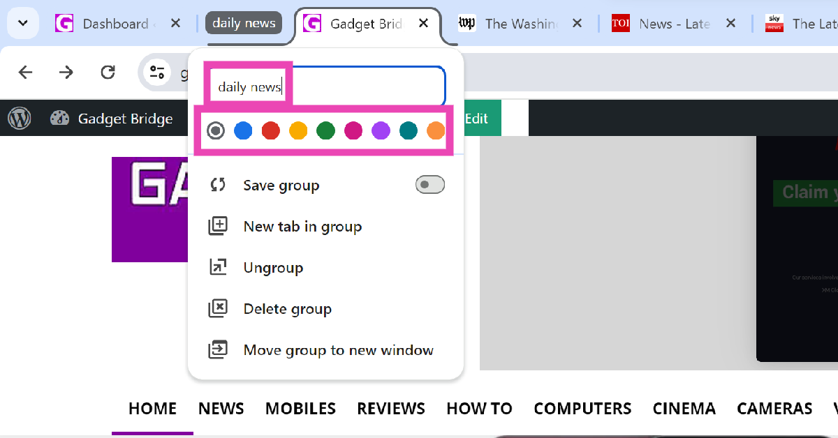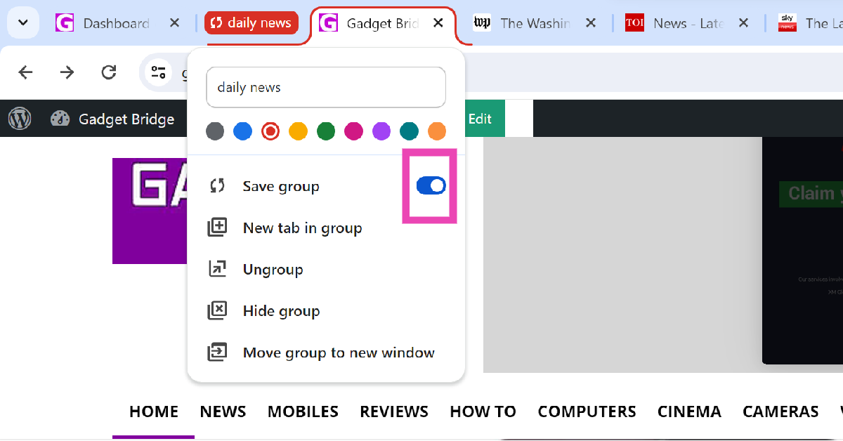 Stap 4:Zet de tuimelschakelaar aan voorGroep opslaan. Wanneer u een tabbladgroep opslaat, wordt deze weergegeven in hetbladwijzerbalk.