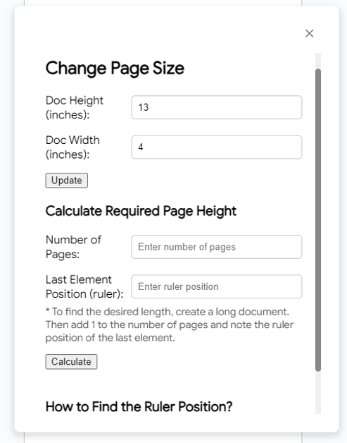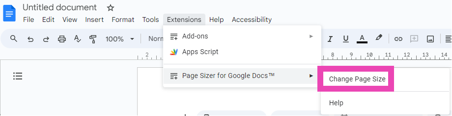 Open een document en ga naarBestand>Pagina-instelling>Papierformaatom de grootte ervan te veranderen. U kunt voor deze taak ook de add-on Page Sizer gebruiken.
