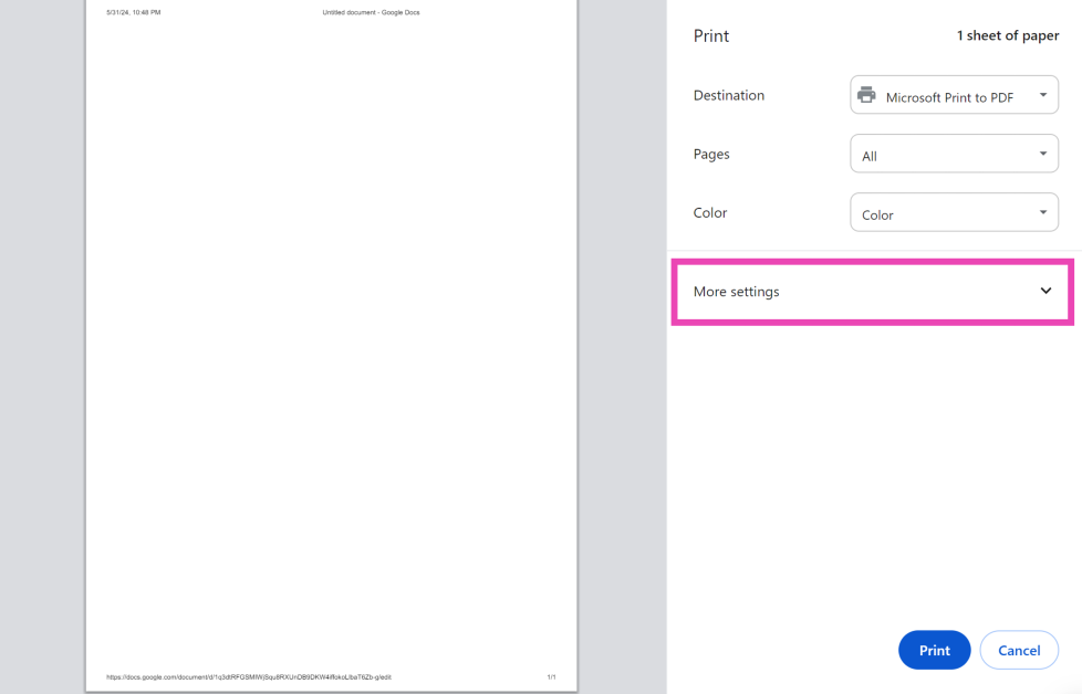 Klik in het afdrukvoorbeeldvenster op Meer instellingen, klik vervolgens op 'Papierformaat' en kies het gewenste formaat.