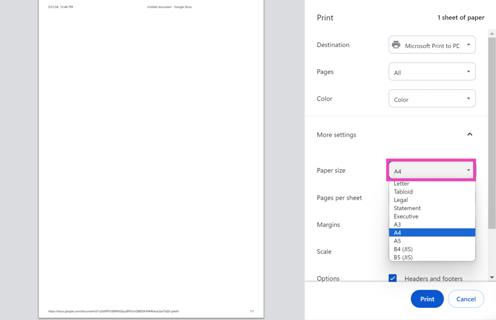 Als u geen A4-papier meer heeft en dringend een document wilt afdrukken, hoeft u zich geen zorgen te maken. Het afdrukvoorbeeldvenster in Google Docs heeft een zeer handige optie om het papierformaat te wijzigen. U kunt kiezen uit Letter, Tabloid, Legal, Statement, Executive, A3, A4, A5, B4 (JIS) en B5 (JIS). Voordat u het document afdrukt, moet u ervoor zorgen dat de tekst is uitgelijnd met de lay-out.