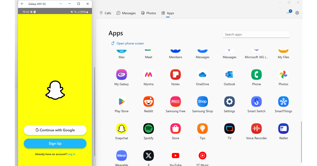 Als u uw telefoon en pc gekoppeld houdt via Microsoft's Phone Link, hoeft u de app of het webportaal van Snapchat niet te gebruiken. Open eenvoudigweg de app in de Phone Link-interface op uw pc. Het addertje onder het gras is dat slechts een paar OEM's app-toegankelijkheid voor Phone Link toestaan. Als u een Samsung- of OnePlus-gebruiker bent, hoeft u zich hier geen zorgen over te maken.
