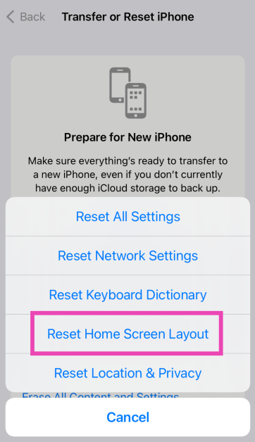 Ga naarInstellingen>Algemeen>iPhone overbrengen of resetten>Reset>Indeling startscherm herstellenen selecteer ‘Startscherm opnieuw instellen’.