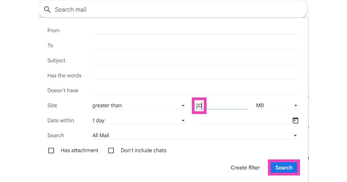 Druk op het filterpictogram in de zoekbalk, voer een minimumgrootte in en klik op ‘Zoeken’. U kunt ook groter:20M in de zoekbalk typen en op Enter drukken om e-mails groter dan 20M te filteren. Vervang ‘20’ door het gewenste formaat om uw inbox te filteren.