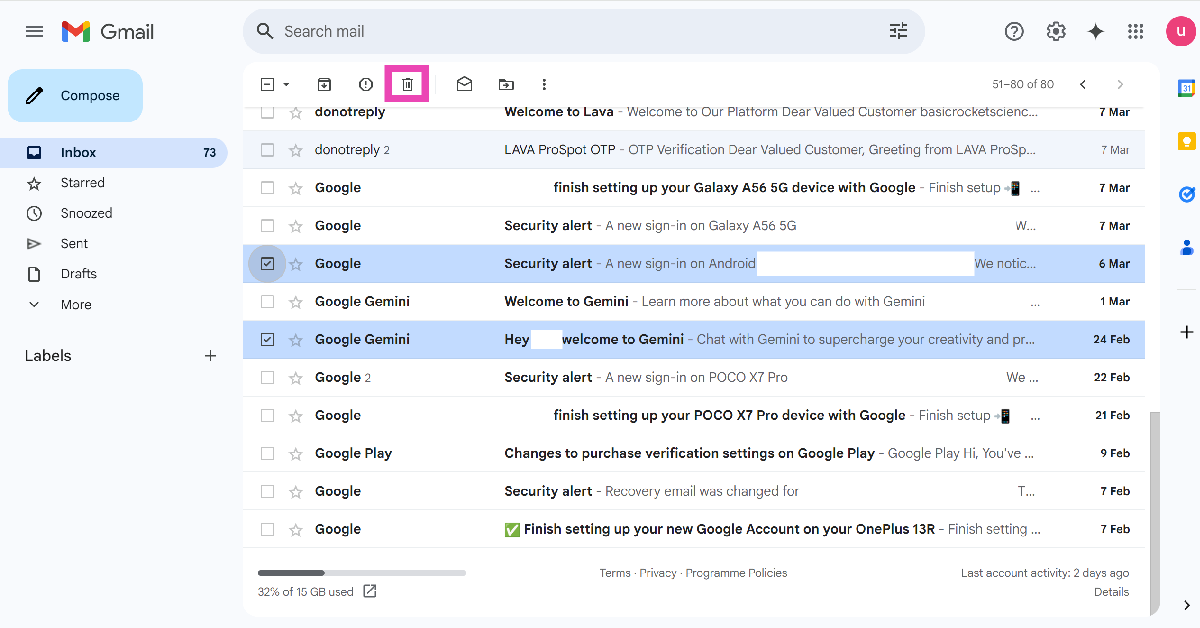 Stap 4:Raak deselectievakjenaast de e-mails die u wilt verwijderen en klik op het prullenbakpictogram.