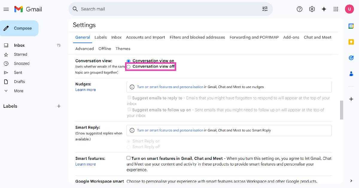 Stap 4:Selecteer deGesprekweergave uitgeschakeldoptie.