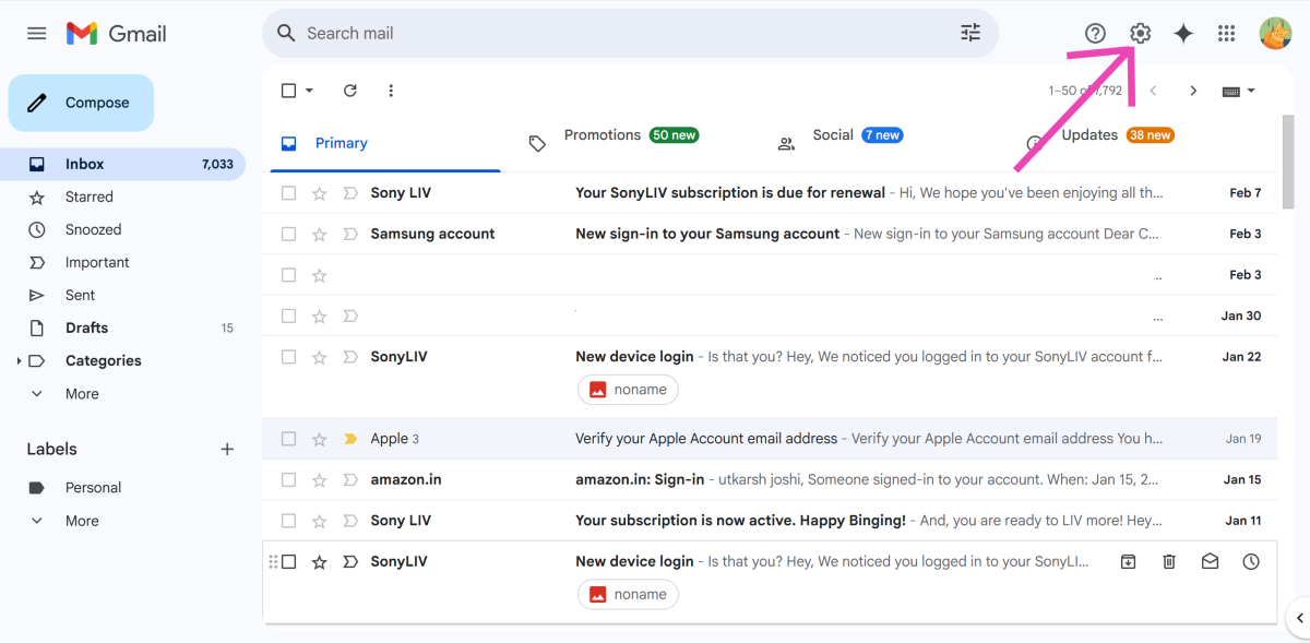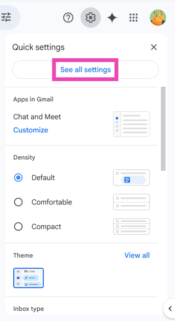 Stap 1:Ga naar jouwGmail-inboxen klik op detandwielpictogrambovenaan het scherm.