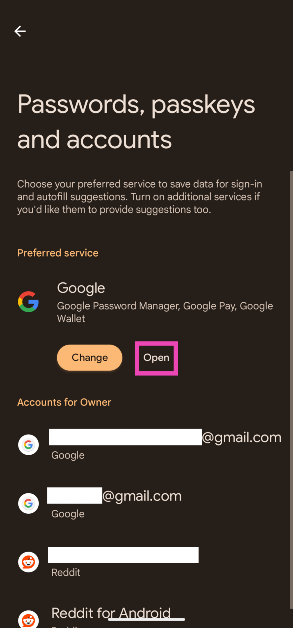 Ga naarInstellingen>Wachtwoorden, wachtwoordsleutels en accounts, klik op ‘Wijzigen’ onder Google en selecteer de apps van uw voorkeur van derden.