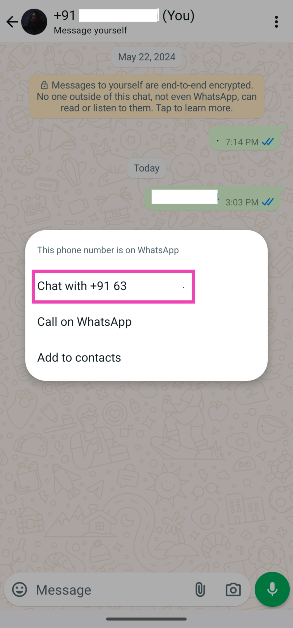 Stap 3:Er wordt een nieuwe chatthread geopend in de WhatsApp-app, waar je kuntberichten verzendennaar het niet-opgeslagen nummer.