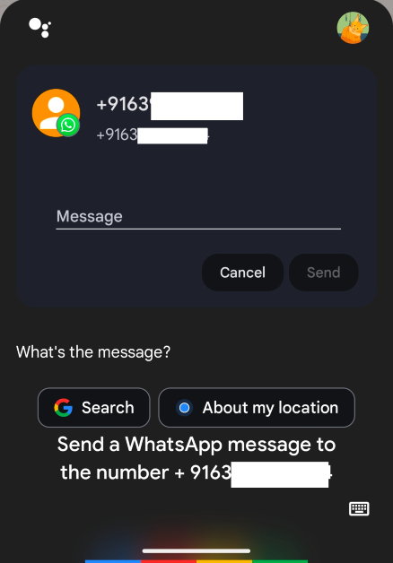 Stap 1:Inspraak 'Hey Google, stuur een WhatsApp-bericht naar [telefoonnummer]’. Vervang ‘telefoonnummer’ door dat van de gebruikertelefoonnummerinclusief de landcode.