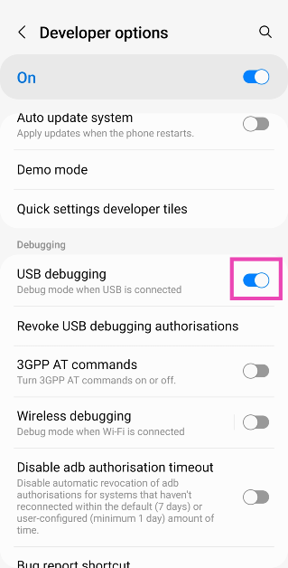 Stap 5:Zet in het gedeelte Foutopsporing de tuimelschakelaar aan voorUSB-foutopsporing.