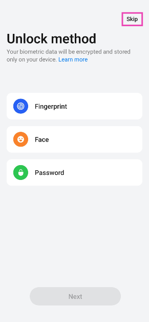 Stap 4:Tik opOverslaanin de rechterbovenhoek van het scherm op deOntgrendelingsmethodepagina.
