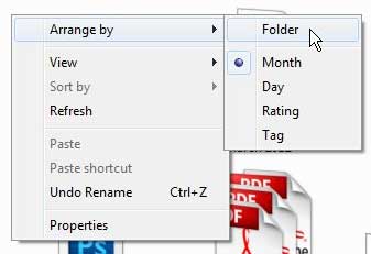 De map Afbeeldingen bevat een extra item in het snelmenu, genaamdRegelen doormenu. Met deze optie kunt u de afbeeldingen in die map sorteren opMaand,Dag,BeoordelingofLabel. Als u er echter voor kiest om uw afbeeldingen met een van deze parameters te sorteren, worden een aantal andere items in het snelmenu gewijzigd en verwijderd die u waarschijnlijk gewend bent te gebruiken.