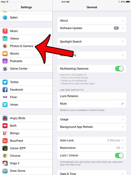 Stap 2: Blader naar beneden in de kolom aan de linkerkant van het scherm en raak vervolgens aanFoto's en cameraoptie.