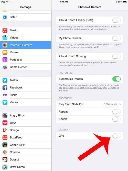 Maar deze optie kan naar believen worden in- of uitgeschakeld, dus lees hieronder verder om erachter te komen hoe u het cameraraster op uw iPad kunt uitschakelen.