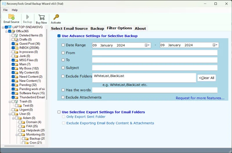 - Denne programvaren har et avansert filteralternativ som lar brukere konvertere spesifikke e -postmeldinger ved å bruke datoområde, til, fra, dato, emne osv. Også brukere kan ekskludere uønskede og tomme mapper som spam, søppelkass, etc.