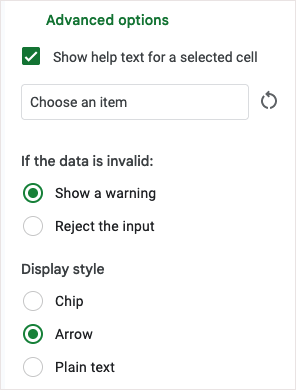 - For å vise hjelpetekst, velg handlingen for ugyldige data, eller velg visningsstilen, utvide delen Avanserte alternativer.