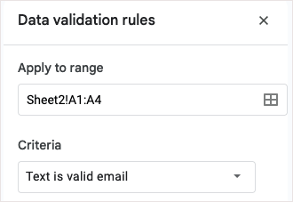 - Når sidefeltet for datavalideringsregler åpnes, velger duLegg til regel, bekreft eller juster cellene iPåfør på rekkeviddefelt, og velgTekst er gyldig e-posti nedtrekksboksen Kriterier.