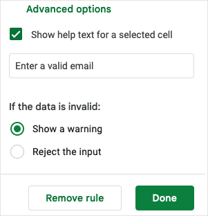 - Velg eventuelt Avanserte alternativer som å vise hjelpetekst, vise en advarsel eller avvise inndata. PlukkeFerdigfor å lagre og bruke valideringsregelen.