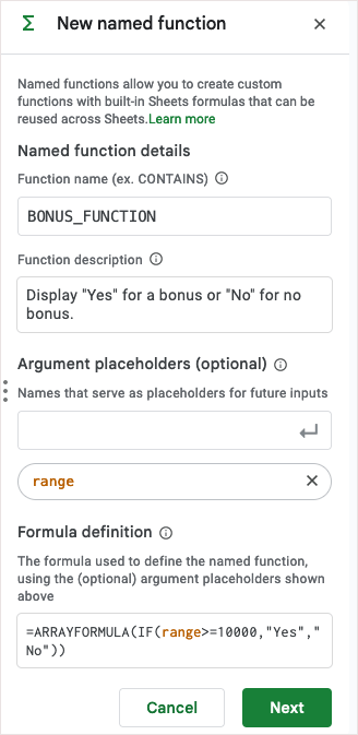 - Skriv inn funksjonsnavnet, beskrivelsen og eventuelt argumentplassholdere. Skriv inn formelen du vil bruke for å definere funksjonen og velgNeste.