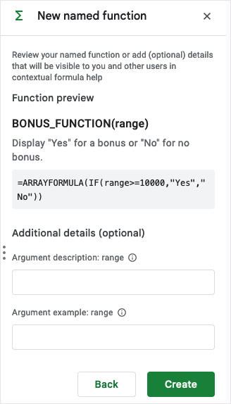 - Sjekk ut funksjonsforhåndsvisningen og velg entenTilbakeå gjøre endringer ellerSkapefor å lagre den nye funksjonen. Legg merke til at du også kan legge til valgfrie argumenter om nødvendig.