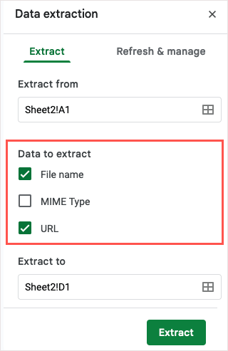 - Når sidefeltet åpnes, brukUtdragfor å merke av i avmerkingsboksene for de elementene du vil trekke ut.