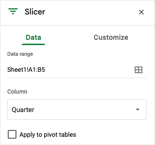 Når sidefeltet åpnes, åpner duDatafanen, bekreft dataområdet øverst, og velg deretter kolonnen som skal brukes for filteret.