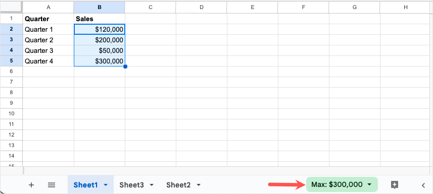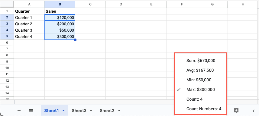 Noen ganger vil du se en rask beregning uten å legge til en formel på arket ditt. I Google Sheets kan du ganske enkelt velge verdiene og deretter velge en beregning du vil se uten ekstra arbeid.