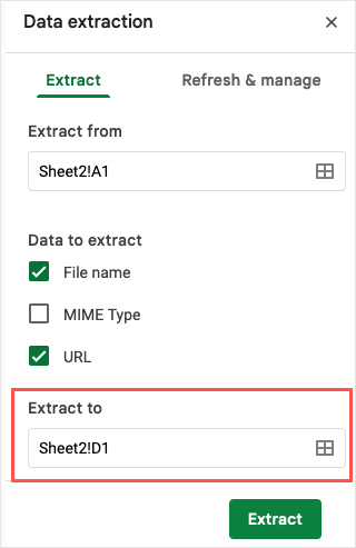 - BrukTrekk ut tilfeltet for å angi eller velge arkplasseringen der du vil ha dataene.