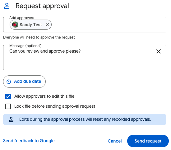 I popup-vinduet legger du til de du ønsker for å godkjenne forespørselen din og eventuelt en melding. Du kan også inkludere en forfallsdato, la godkjennerne redigere arket eller låse filen før du sender forespørselen om godkjenning. VelgeSend forespørselnår du er ferdig.