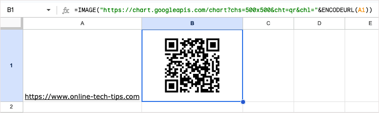 =IMAGE(“https://chart.googleapis.com/chart?chs=500×500&cht=qr&chl=”&ENCODEURL(A1))