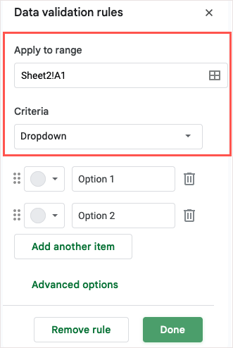 - Du vil da se sidefeltet for datavalideringsregler åpen. Skriv inn plasseringen for listen iPåfør på rekkeviddeboksen og bekreft detDropdowner valgt i rullegardinmenyen Kriterier.