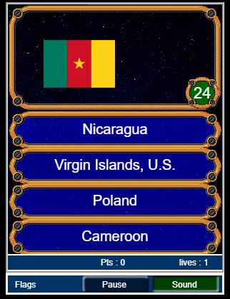 RubyCaves spill Flags handler om flaggidentifikasjon. Du har 30 sekunder på deg til å gjette hvilket land flagget representerer. Hvis du velger å opprette en konto, kan du laste opp poengsummen din og vinne medaljer.
