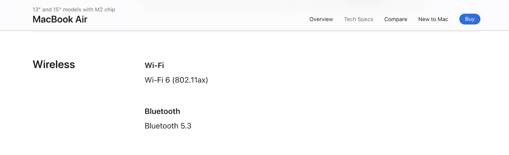 På lanseringstidspunktet i 2022 støttet 13-tommers MacBook Air drevet av M2-brikken Bluetooth 5.0. og nå støtter den Bluetooth 5.3.staterden bærbare datamaskinens tekniske spesifikasjonsside.