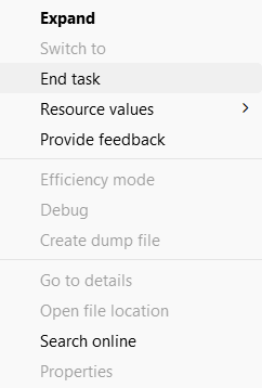 - Høyreklikk på programmet og velgAvslutt oppgave.