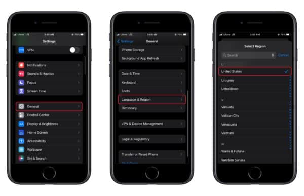 - Til slutt, trykkRegionog velgForent stater.