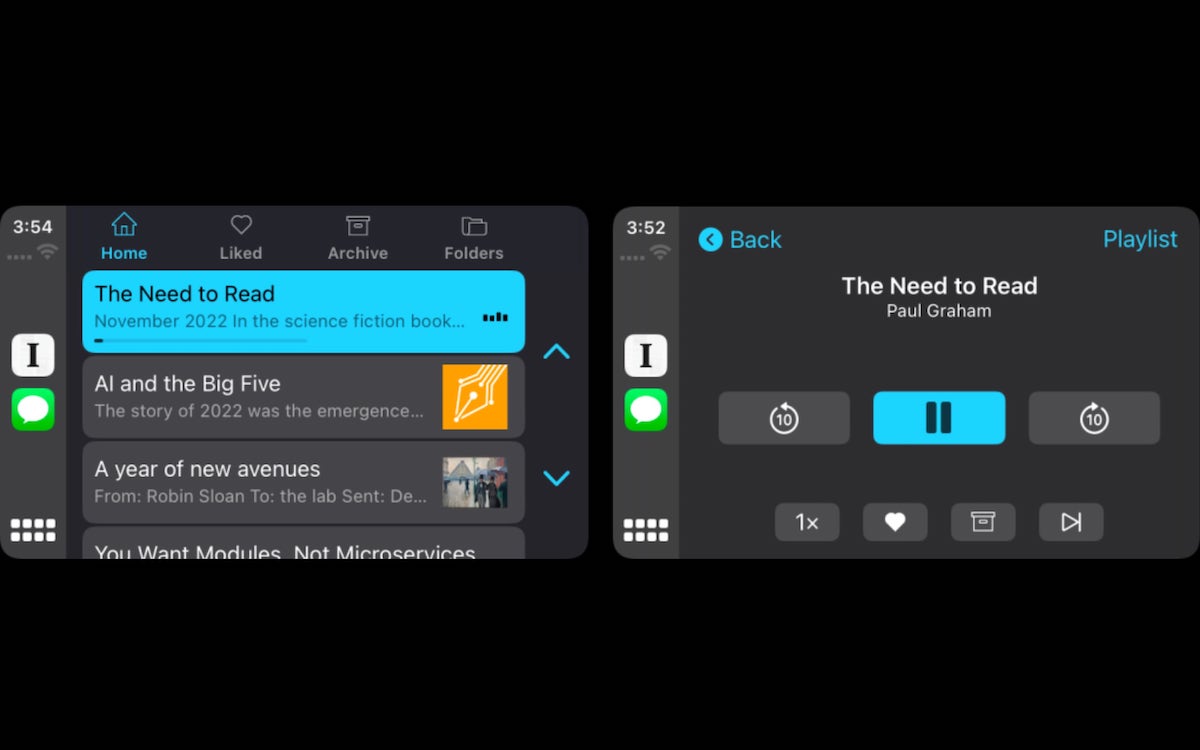 4. mai 2023:Populær les-det-senere-app, Instapaper er nå tilgjengelig på CarPlay. CarPlay-versjonen av appen bruker tekst-til-tale-teknologi for å lese artikler med en rekke stemmer og lar brukere lytte til hele Instapaper-biblioteket mens de kjører, inkludert artikler i Like, Archived, Home og Folders.
