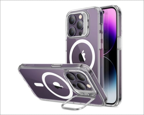 Hvis du vil ha noe som ser annerledes ut, prøv ESRs Classic Kickstand Case med Halo Lock. I stedet for den vanlige ringholderen som fungerer som støtte, er denne integrert i kameramoduldekselet. Den kommer med en Magsafe-kompatibel halo-ring som har kraftige innebygde magneter for enklere og raskere sted-og-gå trådløs lading.