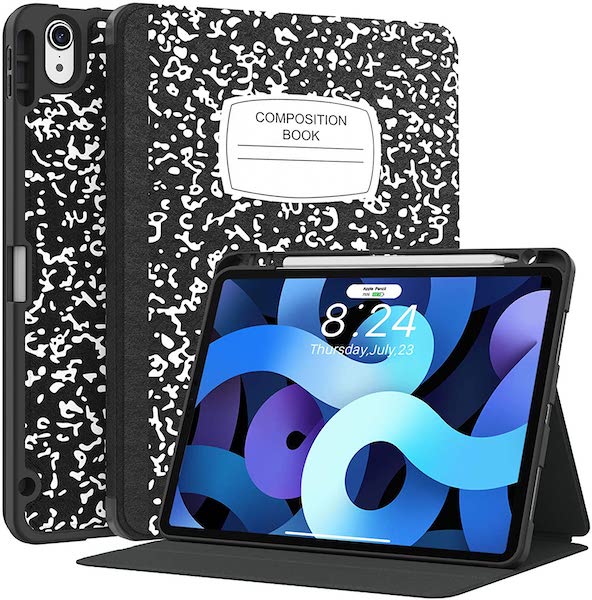 DeSupveco iPad Air 5 dekslermed klasse "Composition Notebook"-design er ideelle for studenter eller alumni som ønsker å se på videregående skoledager. Laget for 10,9-tommers iPad Air 5. og 4. generasjonsmodeller, "Composition Notebook" iPad Air 5-deksler er laget med fleksibel silikon og gir full beskyttelse mot riper og støt, og er tilgjengelig i en rekke farger.