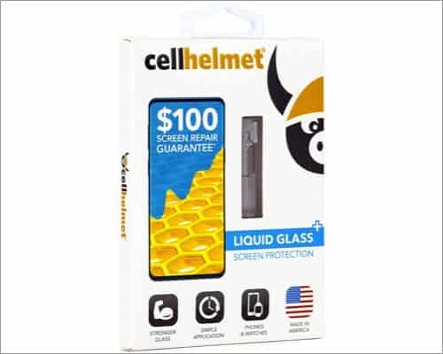 Den er laget i Tyskland og skaper et usynlig beskyttende belegg som øker skjermens styrke til 9H hardhet. Dessuten, hvis enheten din er skadet mens den er beskyttet av dette flytende glasset, gir en begrenset erstatningsgaranti opptil $250 forsikringsdekning mot skjermreparasjon.