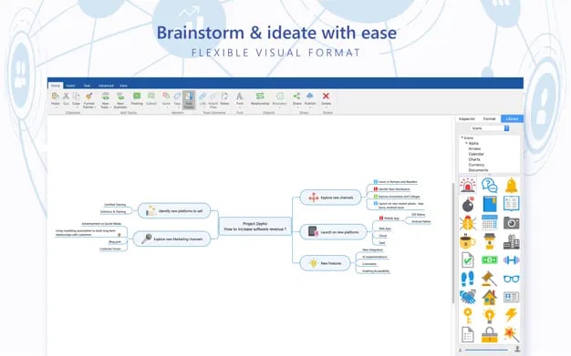 Hvis du er en Microsoft Office-bruker, vil du like det du ser med MindManager. Grensesnittet har faner på toppen med et bånd fullt av knapper under, og den blå aksenten får det til å se ut som Microsoft Word. Du har også nyttige verktøy i en sidefelt til høyre for formatering, en inspektør og et bibliotek.
