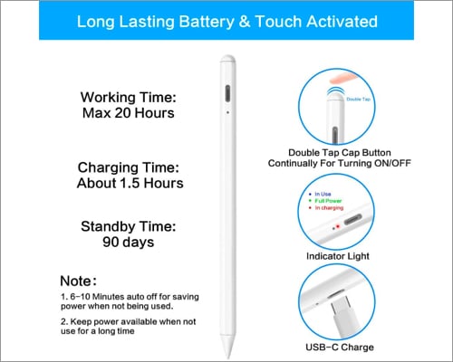 Denne pennen kommer med en kapasitiv backend-tupp for rulling, mens den andre enden har en spiss av høy kvalitet for å skrive eller skissere. Dessuten har den funksjoner som Palm Rejection og Tilt Recognition. Den kobles enkelt sammen med de nyere iPad-modellene, spesielt de som ble utgitt i 2018 eller senere. Produsenten har også hevdet at den varer opptil 8 timer ved konstant bruk.