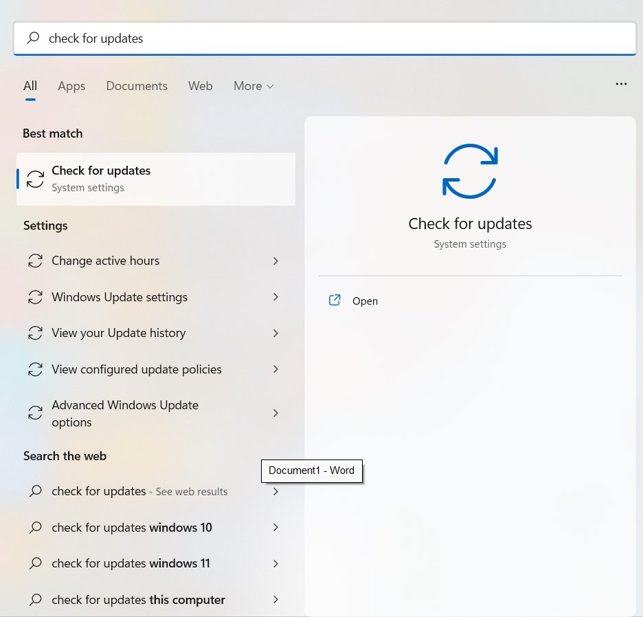 - Klikk på søkeboksen for å skriveSe etter oppdateringerog dobbeltklikk på den fra resultatene.