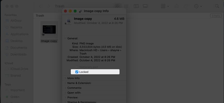 Noen ganger kan en fil med et låst ikon hindre deg i å tørke papirkurven. For å fikse dette, gå tilSøppel→ kontroll-klikk på filen → velgFå info→ til boksen ved siden avLåst. Du kan nå fortsette å tømme søppelkassen.