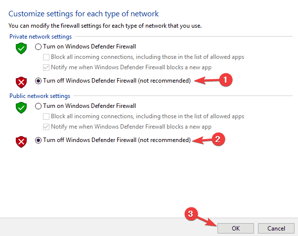 - VelgeSlå av Windows Defender-brannmur (anbefales ikke) for både private og offentlige nettverksinnstillinger.