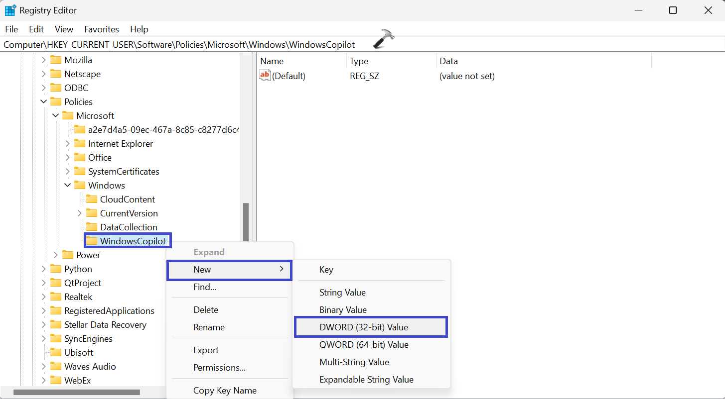 For å opprette en nøkkelverdi, høyreklikk på "WindowsCopilot" og velg "Ny => DWORD (32-bit) verdi“.