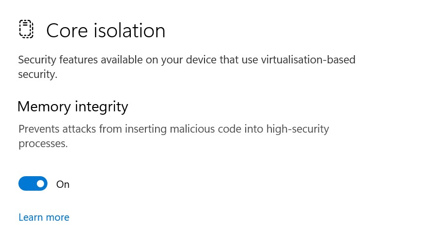 Deaktivering av minneintegritetsfunksjonen og testing av den kan løse problemet. Minneintegritetsfunksjonen er tilgjengelig på Windows Security.