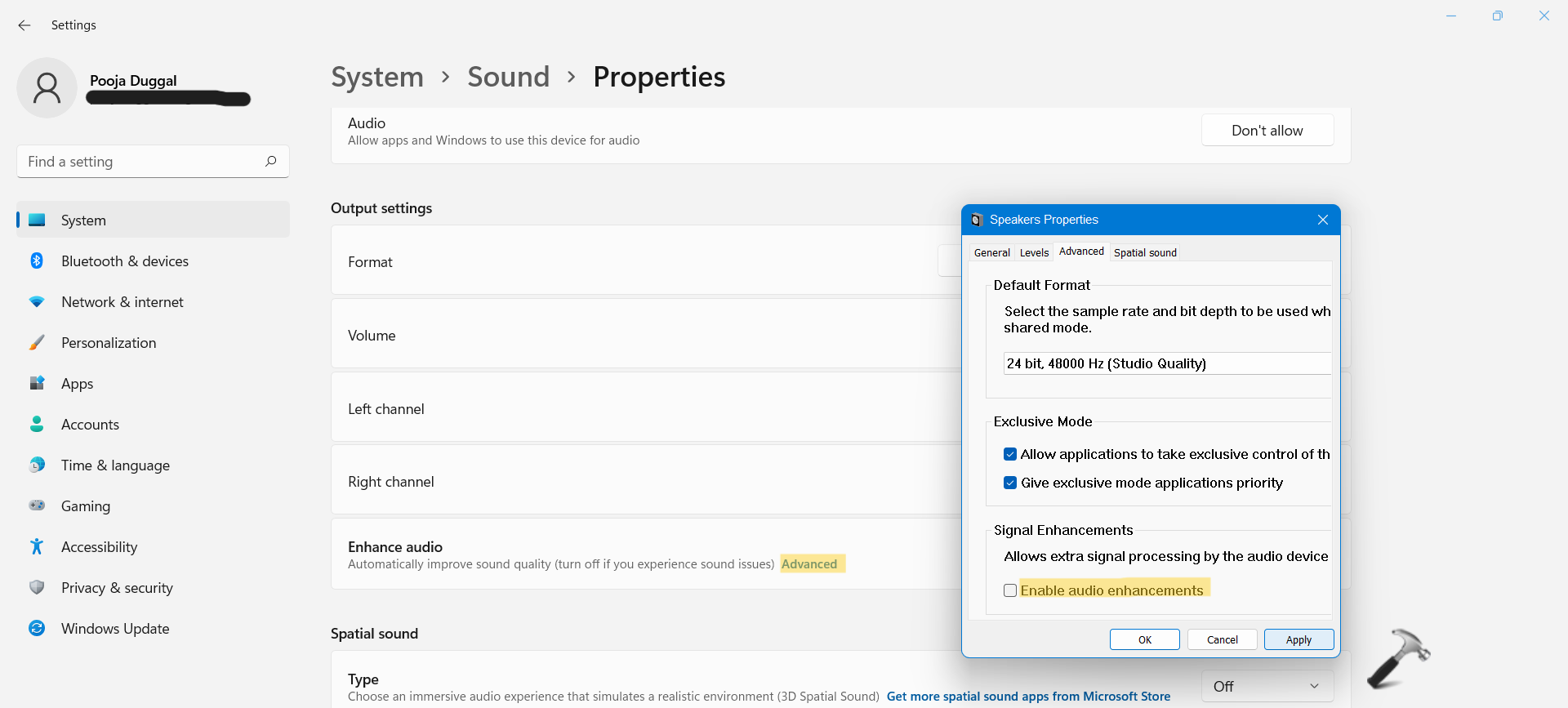 3.Deretter fjerner du merket i boksen ved siden avForbedre lydforbedringerfor å deaktivere dem.