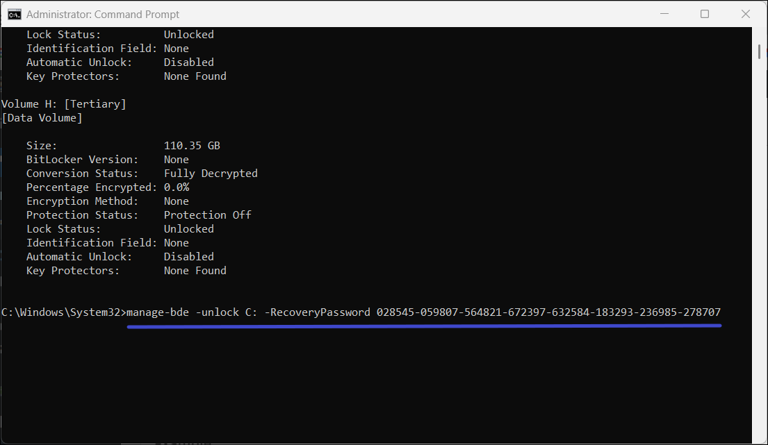 manage-bde -unlock C: -RecoveryPassword 028545-059807-564821-672397-632584-183293-236985-278707